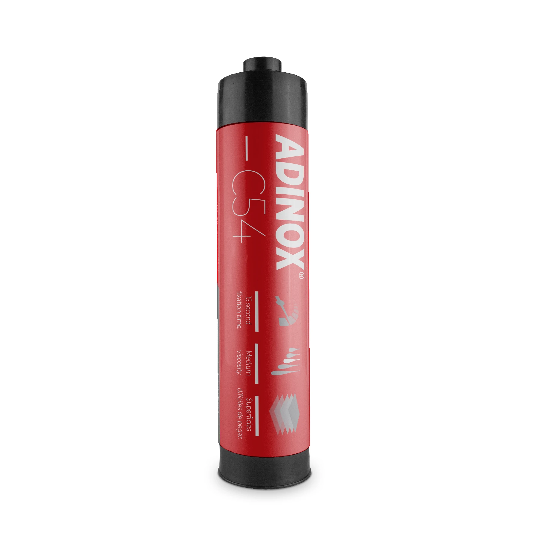 El C54 une neopreno, PVC, ABS, policarbonato, aluminio y acero al carbono directamente. Para sustratos difíciles como polietileno y polipropileno, pre-trate con promotor de adhesión ADINOX® 770. No recomendado para vidrio o silicona.